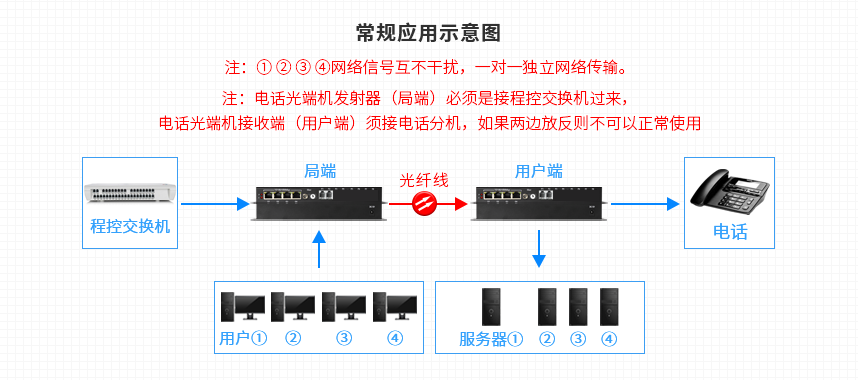 2路电话光端机(带四路千兆网络)采用国际先进的全数字视频及光纤传输技术,避免了模拟调频、调相、调幅光端机易产生交调失真干扰、两路电话相互串扰、产品性能易受环境因素影响等缺点,将2路电话,4路千兆网络在单芯光纤上实时同步、无失真、高质量地传输。即插即用的设计使得安装简便易行, 无需进行现场调节, 其光模块和核心电路均采用进口工业级芯片、全表面贴装,以及先进的开关电源、防电磁辐射装置等技术,稳定性高,所有的光、电接口均符合国际标准,确保了该产品能在各种复杂环境下长期无故障连续运行。通过对电话信号的全数字无压缩传输方式,无论在多么复杂光传输链路条件下,全数字系列光端机都有能力确保高质量的信号传输指标。全数字光端机支持单模或多摸光纤传输,光接口形式FC/ST/SC可选。全数字光端机还提供丰富的电源、光纤链路状态、电话,网络信号输入、输出,数据输入、输出有效指示功能,使得用户安装调试十分方便。